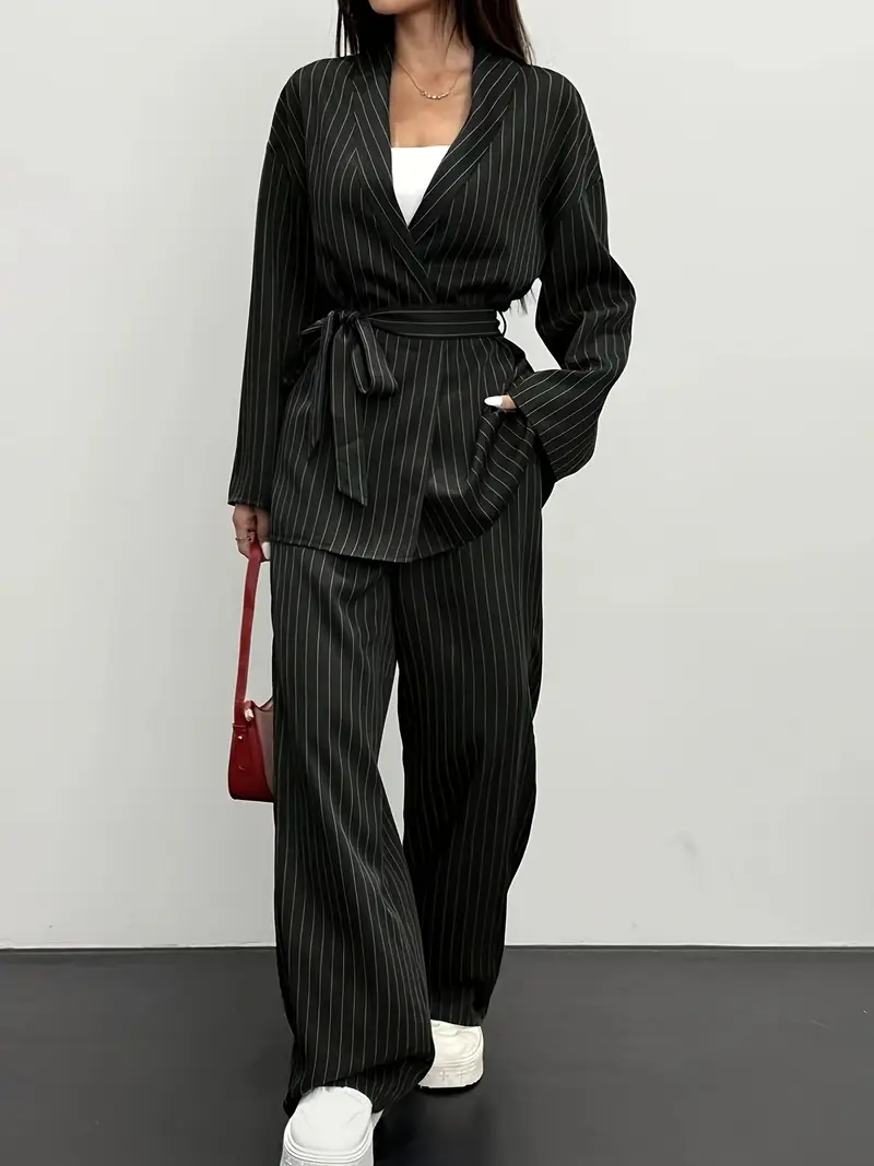 Designed with sophisticated tailoring and a matching belt for a defined waist, it transitions seamlessly from office meetings to after-hours outings. Crafted from breathable, all-season fabric, this set delivers the ideal balance of structure and comfort for year-round wear.