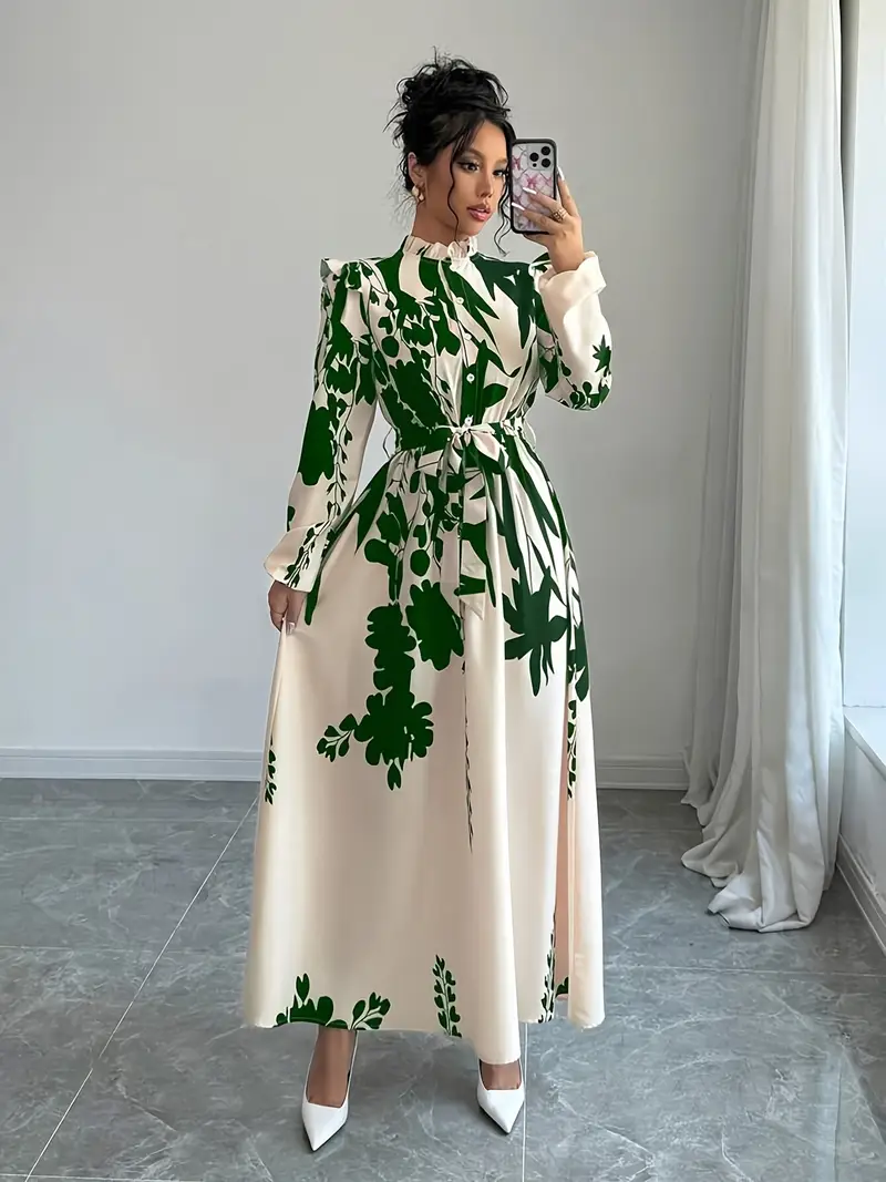 Embrace effortless elegance with our Elegant Floral Print Long Sleeve Dress, a timeless piece that captures feminine charm with every detail. The A-line maxi silhouette flatters every figure, while the stand collar, waist detailing, and ruffle hem create a beautifully balanced, graceful look.